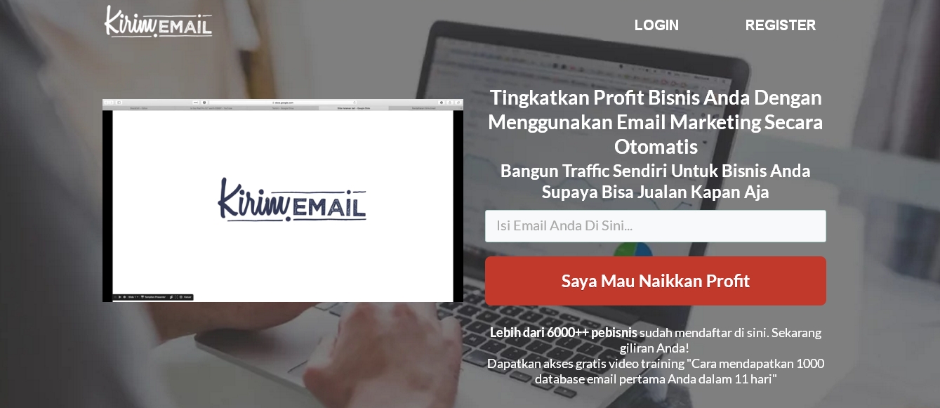 Dari pengunjung yang datang, mereka akan masuk dalam halaman awal, yaitu landing page yang populer digunakan. VIdeo penjelasan di sebalh kanan dan formulir untuk mendapatkan data email pengunjung di sebelah kiri.